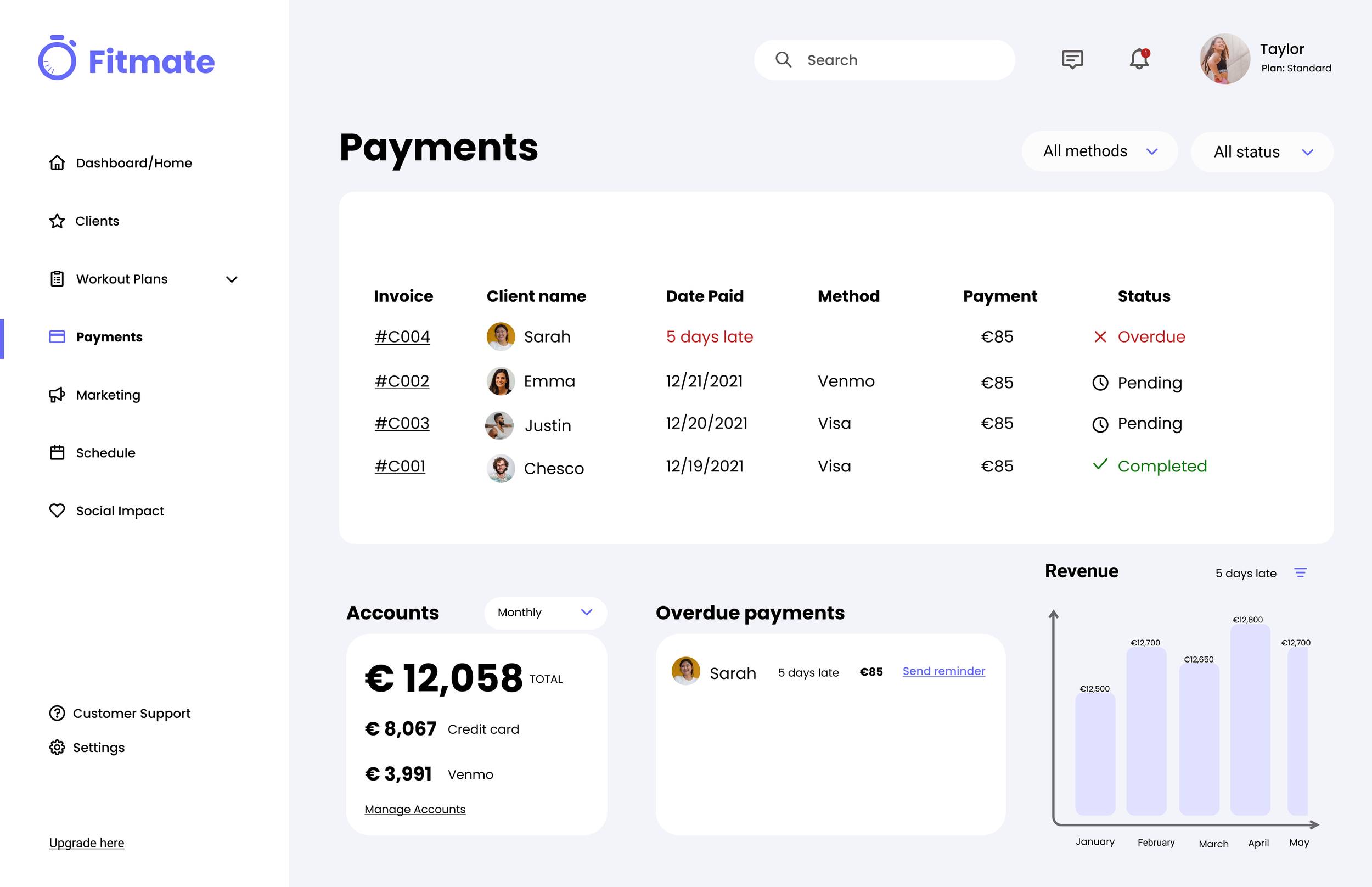 We designed a revenue overview within the command center that surfaced incoming payments, overdue balances, and projected earnings at a glance. Rather than building full accounting functionality, we focused on visibility and early signals. This preserved clarity while reinforcing financial awareness as part of the trainer’s daily workflow.